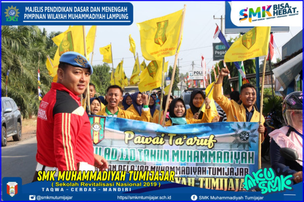 SMK MUHAMMADIYAH TUMIJAJAR – Sekitar kurang lebih 50 peserta Ikatan Pelajar Muhammadiyah SMK MUTU Tulangbawang Barat, Lampung memadati Pawai Taaruf yang mengelingi jalan raya dan jalan 2 Dayamurni-Daya Asri dalam rangka menyemarakan Milad Muhammadiyah ke-110 Hijriyah yang digelar SMK MUTU, Jumat (9/8).