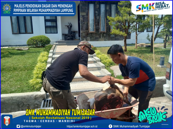 SMK Muhammadiyah Tumijajar -- Usai prosesi penyembelihan hewan kurban berjalan dengan lancar, selanjutnya adalah pembagian daging kurban ke penerima, salah satu diantaranya adalah masyarakat yang berada di sekitar lingkungan SMK MUTU, Tulangbawang Barat, Lampung. Distribusi daging kurban dimulai pukul 10.00 WIB oleh panitia pelaksana bersama dengan Ikatan Pelajar Muhammadiyah (IPM) SMK MUTU.