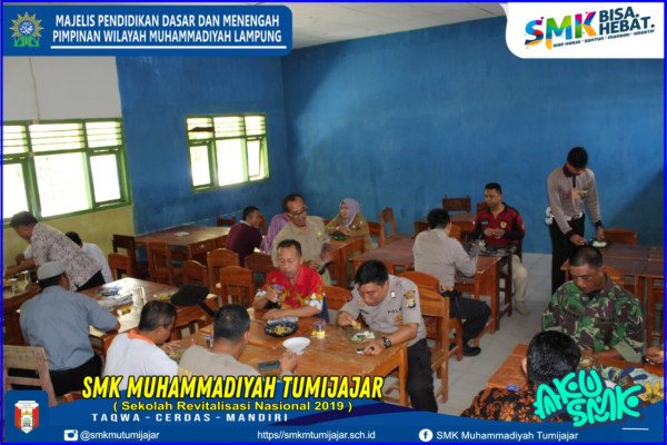 SMK MUHAMMADIYAH TUMIJAJAR-- Usai penyembelihan hewan kurban dan pembagian daging kurban dalam rangkaian ibadah Idul Adha 1440 Hijriyah di SMK MUTU Tulangbawang Barat, Lampung, Kepala SMK MUTU Bapak Syamsul Hidayat,S.Pd.I., melaksanakan ramah tamah bersama Kepala SMP seluruh wilayah Tumijajar, Tulangbawang Tengah, Tulangbawang Udik, dan Koramil Tumijajar serta Polsek Tumijajar, Senin (12/8).