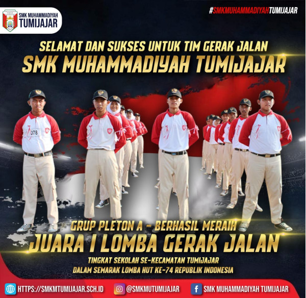 SMK Muhammadiyah Tumijajar -- Prestasi membanggakan kembali diraih SMK MUTU, Tulangbawang Barat, Lampung, pasalnya dua tim gerak jalan yang dikeluarkan untuk berlaga dalam ajang Lomba Gerak Jalan Tingkat Sekolah se-Kecamatan Tumijajar untuk memeriahkan HUT ke-74 RI berhasil menyabet dua juara sekaligus, yakni juara I untuk tim A dan juara III untuk tim B.