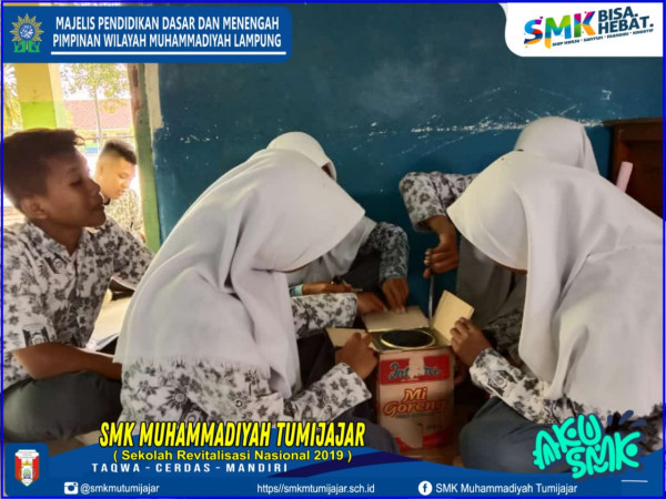 SMK Muhammadiyah Tumijajar -- Kegiatan pembelajaran Produk Kreatif dan Kewirausahaan di kelas XI Multimedia B hari ini (21/8) diisi dengan praktik pembuatan produk kreatif yang ramah lingkungan. Produk kreatif ramah lingkungan ini dibuat dengan menggunakan barang bekas baik dari bahan plastik maupun organik.