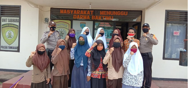 Para siswa SMK Muhammadiyah Tumijajar foto bersama personil polisi Polsek Tumijajar usai melakukan bersih-bersih, sembari mengadakan sosialisasi Bahaya Narkoba. Mereka berkampanye agar pemuda dan pemudi harapan bangsa siap melawan dan menolak peredaran Narkoba di Tulang Bawang Barat hingga dapat terbebas dari pengaruh bahaya narkoba, serta berharap corona segera berakhir.