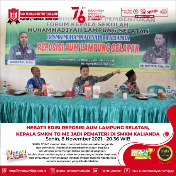 Masih edisi pengembangan instansi, SMK Muhammadiyah Tumijajar berkesempatan untuk bersilahturahmi ke SMK Muhammadiyah Kalianda, Lampung Selatan. Tak lain dan tak bukan, kedatangan kepala SMKM TO ME ini adalah mengenai agenda "Rapat koordinasi dan Pembentukan Forum Kepala Sekolah Muhammadiyah Lampung Selatan" terkhusus Reposisi AUM Kabupaten Lampung Selatan.