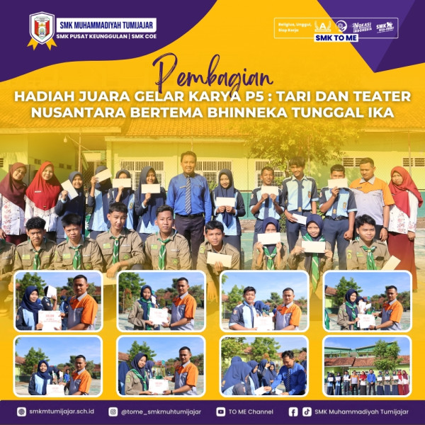 SMK TO ME - SMK Muhammadiyah Tumijajar menggelar acara pembagian hadiah bagi para juara dalam Gelar Karya Projek Penguatan Profil Pelajar Pancasila (P5) yang mengusung tema "Bhinneka Tunggal Ika." Projek P5 pada semester ini berfokus pada Tari dan Teater Nusantara, sejalan dengan tema kebhinnekaan yang diangkat untuk memperingati Bulan Sumpah Pemuda. Acara ini bertujuan untuk menggugah semangat kebangsaan dan pelestarian budaya di kalangan siswa.