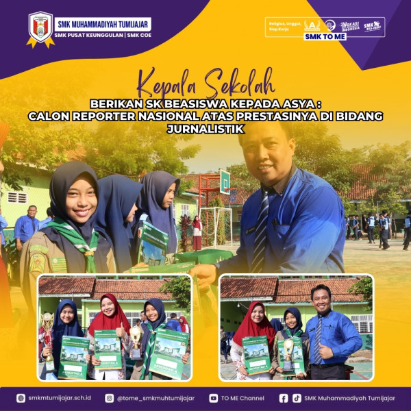 SMK TO ME – Plt. Kepala SMK Muhammadiyah Tumijajar, Bapak Sucipto, S.Pd., memberikan Surat Keputusan (SK) Beasiswa kepada Asya Nasyilfa Septiyansah, siswi kelas X PBS, atas prestasinya yang membanggakan di bidang jurnalistik. Asya berhasil meraih Juara 3 News Anchor tingkat Provinsi Lampung dalam ajang *SUKMA FAIR 2024* yang diselenggarakan di Politeknik Negeri Lampung (POLINELA). Prestasi ini semakin mengukuhkan potensi luar biasa yang dimiliki oleh para siswa SMK Muhammadiyah Tumijajar dalam bidang ekstrakurikuler jurnalistik.
