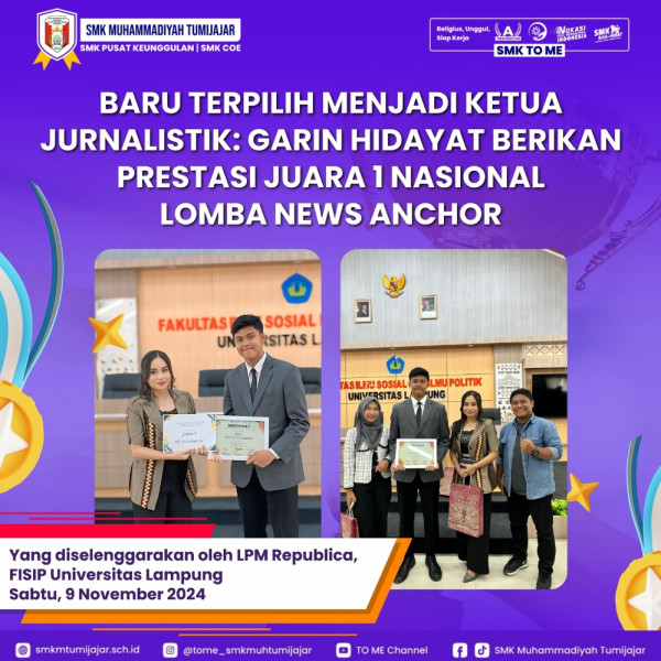 SMK TO ME – Garin Hidayat, siswa SMK Muhammadiyah Tumijajar kelas X DKV A, berhasil meraih Juara 1 dalam Lomba Nasional News Anchor yang diselenggarakan oleh LPM Republica Fisip Universitas Lampung (UNILA). Lomba bergengsi yang mengusung tema "Make Gen Z Shine with Journalism" ini diikuti oleh puluhan peserta dari berbagai jenjang pendidikan, termasuk mahasiswa dan pelajar se-Indonesia.