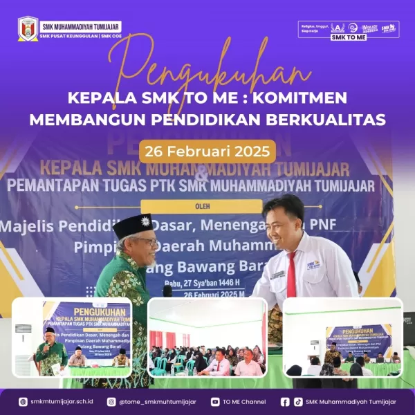 SMK TO ME – SMK Muhammadiyah Tumijajar menggelar acara pengukuhan kepala sekolah baru untuk periode 2025-2029. Bapak Sucipto, S.Pd, secara resmi dikukuhkan sebagai kepala sekolah dalam acara yang berlangsung khidmat di hadapan para tamu undangan. Prosesi pengukuhan dipimpin langsung oleh Ketua Bidang MPDM PNF Tubaba, Bapak Topari, S.Pd.