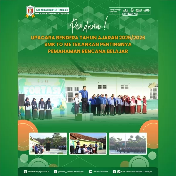 SMKTOME – SMK Muhammadiyah Tumijajar menggelar upacara bendera perdana sebagai penanda dimulainya kegiatan pembelajaran tahun ajaran 2025/2026. Bertempat di halaman sekolah, upacara ini diikuti oleh siswa kelas X dan XI, sementara siswa kelas XII tidak hadir karena sedang menjalankan Praktik Kerja Lapangan (PKL) di dunia usaha dan dunia industri.