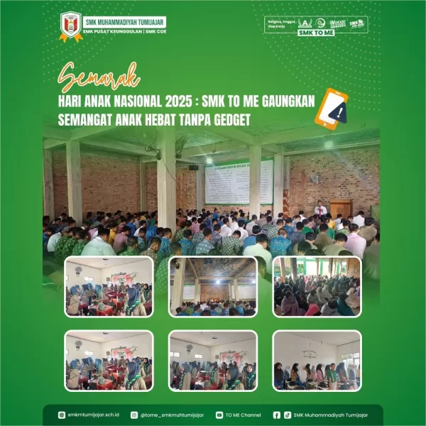 SMK TO ME - Bertepatan dengan peringatan Hari Anak Nasional, SMK Muhammadiyah Tumijajar (SMK TO ME) turut menyemarakkan momen ini dengan melaksanakan Senam Anak Indonesia Hebat, yang diselenggarakan serentak sebelum kegiatan belajar mengajar dimulai.
