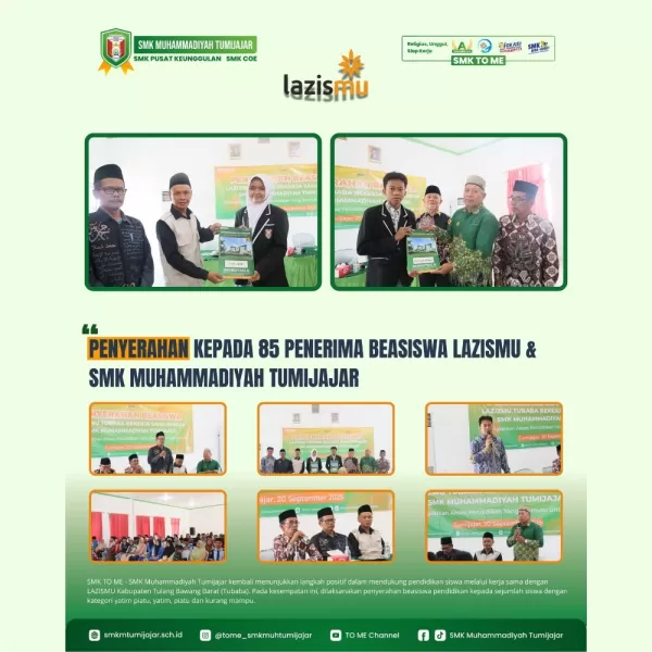 SMK TO ME - SMK Muhammadiyah Tumijajar kembali menunjukkan langkah positif dalam mendukung pendidikan siswa melalui kerja sama dengan LAZISMU Kabupaten Tulang Bawang Barat (Tubaba). Pada kesempatan ini, dilaksanakan penyerahan beasiswa pendidikan kepada sejumlah siswa dengan kategori yatim piatu, yatim, piatu dan kurang mampu.