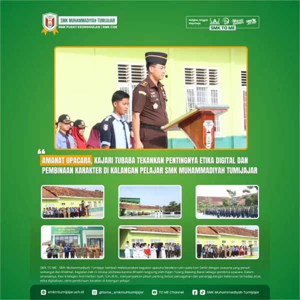 SMK TO ME - SMK Muhammadiyah Tumijajar kembali melaksanakan kegiatan upacara bendera rutin pada hari Senin dengan suasana yang penuh semangat dan khidmat. Kegiatan kali ini terasa istimewa karena dihadiri langsung oleh Kajari Tulang Bawang Barat sebagai pembina upacara. Dalam amanatnya, Kasi Intelegen Ardi Herlian Syah, S.H.,M.H., menyampaikan pesan penting terkait pencegahan dan penanggulangan kekerasan terhadap anak, etika digitalisasi, serta pembinaan karakter di kalangan pelajar.