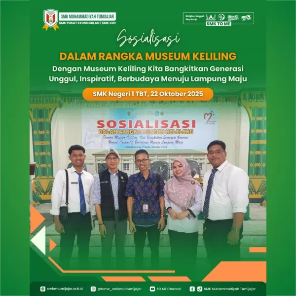 SMK TO ME — SMK Muhammadiyah Tumijajar turut berpartisipasi dalam kegiatan Museum Keliling dengan tema “Dengan Museum Keliling Kita Bangkitkan Generasi Unggul, Inspiratif, Berbudaya Menuju Lampung Maju” yang dilaksanakan di SMK Negeri 1 Tulang Bawang Tengah, Kabupaten Tulang Bawang Barat.