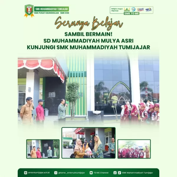SMKTOME - SMK Muhammadiyah Tumijajar kembali menerima kunjungan edukatif dari siswa-siswi SD Muhammadiyah Mulya Asri. Kegiatan ini menjadi bagian dari program pengenalan dunia pendidikan kejuruan sejak dini yang rutin diselenggarakan oleh sekolah untuk menumbuhkan minat dan semangat belajar anak-anak terhadap dunia vokasi.