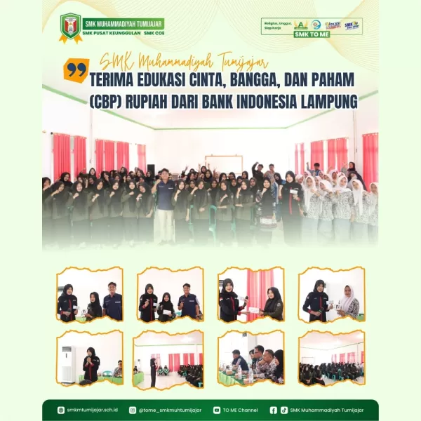 SMKTOME - SMK Muhammadiyah Tumijajar kembali menerima kunjungan istimewa dari Bank Indonesia (BI) Provinsi Lampung. Dalam kesempatan tersebut, BI Lampung menyelenggarakan kegiatan edukatif bertajuk “Cinta, Bangga, dan Paham (CBP) Rupiah” yang diikuti oleh siswa Perbankan Syari'ah (PBS) kelas X, XI, dan XII. Kegiatan ini menjadi sarana pembelajaran penting bagi siswa dalam memahami peran dan makna mata uang Rupiah bagi kehidupan ekonomi bangsa.