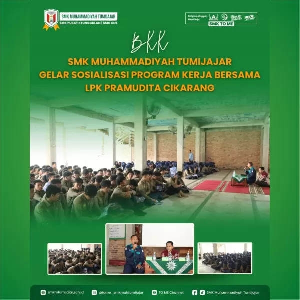 SMKTOME – Dalam upaya memperluas jaringan kemitraan dan meningkatkan peluang penyaluran kerja bagi lulusan, SMK Muhammadiyah Tumijajar menerima kunjungan LPK Pramudita Cikarang untuk melaksanakan kegiatan sosialisasi pada Jum'at, 14 November 2025.