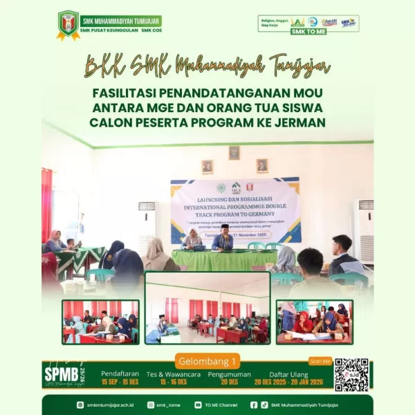 SMKTOME – SMK Muhammadiyah Tumijajar kembali mencatat langkah penting dalam upaya membuka peluang internasional bagi lulusannya. Melalui fasilitasi Bursa Kerja Khusus (BKK), berlangsung Penandatanganan Memorandum of Understanding (MoU) antara Muhammadiyah Global Education (MGE) dan orang tua siswa yang akan mengikuti program penempatan studi dan magang ke Jerman.