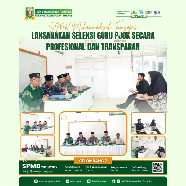 Dengan adanya seleksi yang ketat dan transparan ini, diharapkan SMK Muhammadiyah Tumijajar dapat memperoleh guru PJOK yang profesional, berakhlak mulia, serta mampu mendukung terwujudnya peserta didik yang unggul, sehat, dan berkemajuan. (ptr)
