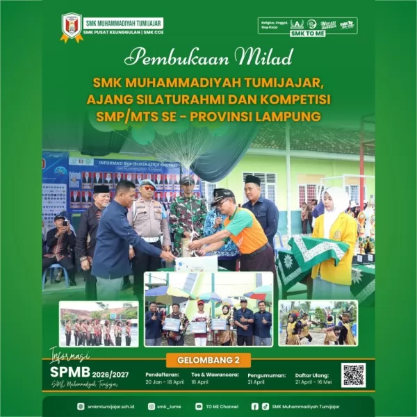 Dengan dibukanya rangkaian kegiatan Milad ini, SMK Muhammadiyah Tumijajar berharap dapat terus menjadi pusat pendidikan kejuruan yang unggul, inspiratif, dan mampu melahirkan generasi muda yang berprestasi, berakhlak mulia, serta siap menghadapi tantangan masa depan. (ptr)