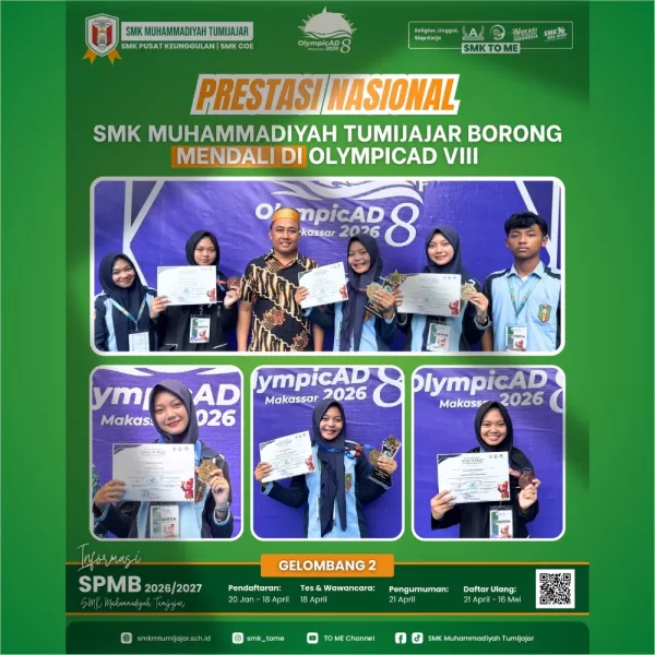 SMKTOME – Prestasi membanggakan kembali ditorehkan oleh siswa SMK Muhammadiyah Tumijajar dalam ajang OlympicAD VIII yang digelar di Makassar. Dalam kompetisi tingkat nasional tersebut, kontingen sekolah berhasil membawa pulang dua medali emas dan satu medali perunggu.