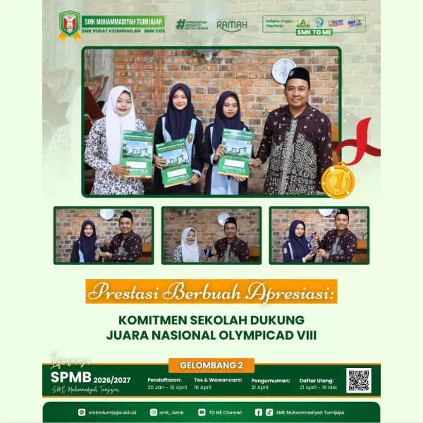 SMKTOME – SMK Muhammadiyah Tumijajar memberikan apresiasi kepada siswa peraih medali pada ajang OlympicAD VIII yang diselenggarakan di Makassar. Apresiasi tersebut berupa beasiswa bebas SPP selama tiga bulan untuk peraih medali emas dan dua bulan untuk peraih medali perunggu.