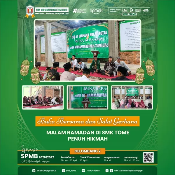 SMKTOME - SMK Muhammadiyah Tumijajar menggelar kegiatan buka bersama yang dirangkaikan dengan shalat gerhana bulan total pada Selasa malam dalam suasana penuh kekhusyukan dan kebersamaan. Kegiatan ini diikuti oleh tamu undangan dan seluruh keluarga besar SMK Muhammadiyah Tumijajar yang antusias memadati lingkungan sekolah sejak sore hari.