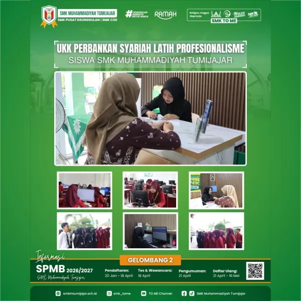 SMKTOME- Uji Kompetensi Keahlian (UKK) Jurusan Perbankan Syariah SMK Muhammadiyah Tumijajar kembali digelar sebagai bentuk evaluasi akhir bagi siswa dalam menguasai keterampilan di bidangnya. Kegiatan ini berlangsung selama dua hari, dimulai pada Selasa, 07 April 2026 hingga Rabu, 08 April 2026.