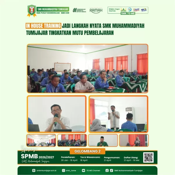 SMKTOME - Dalam upaya meningkatkan kualitas pembelajaran serta administrasi mengajar, SMK Muhammadiyah Tumijajar menggelar kegiatan In-House Training (IHT) yang diikuti oleh seluruh tenaga pendidik. Kegiatan ini dilaksanakan di aula sekolah mulai pukul 13.00 WIB hingga selesai dengan penuh antusiasme dari para peserta.