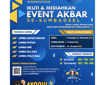 SAMBUT MILAD KE-24, SMK MUTU ADAKAN BERAGAM KOMPETISI SMP/MTS SE-SUMBAGSELKamis (28/11/2019) – 10.42 WIBSMK MUHAMMADIYAH TUMIJAJAR – SMK Muhammadiyah Tumijajar