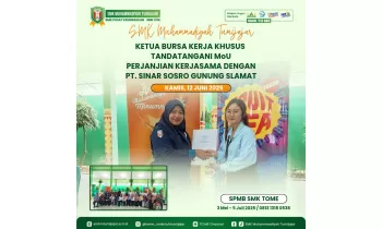 Kamis, 12 Juni 2025 - 17.14 WIBSMK TO ME - Kamis, 12 Juni 2025, SMK Muhammadiyah Tumijajar resmi menjalin kerjasama dengan Dunia Usaha dan Dunia Industri (DUDIKA) melalui penandatanganan Perjanjian Kerjasama (PKS) dengan PT. Sinar Sosro Gunung Slamat. Acara yang