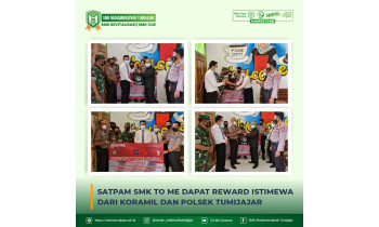 SATPAM SMK TO ME DAPAT REWARD ISTIMEWA DARI KORAMIL DAN POLSEK TUMIJAJARRabu, 26 Januari 2022 – 19.00 WIBSMK TO ME – Hari Ulang Tahun Satpam yang ke 41 jatuh pada tanggal 30 Desember 2021 lalu, diperingati dengan kegiatan bakti social