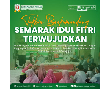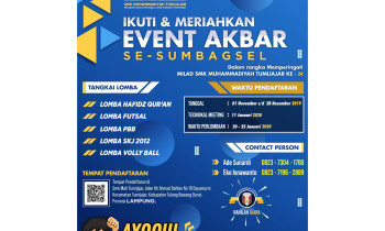 SAMBUT MILAD KE-24, SMK MUTU ADAKAN BERAGAM KOMPETISI SMP/MTS SE-SUMBAGSELKamis (28/11/2019) – 10.42 WIBSMK MUHAMMADIYAH TUMIJAJAR – SMK Muhammadiyah Tumijajar akan mengadakan serangkaian acara lomba dalam rangka Milad Sekolah ke-24 yang diadakan pada tanggal 20 Januari s.d 25 Januari 2020