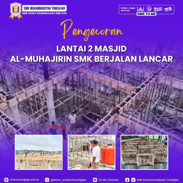 SMK TO ME - Proses pengecoran lantai 2 Masjid Al Muhajirin SMK Muhammadiyah Tumijajar, yang berlokasi di Jalan K.H. Ahmad Dahlan No. 10 Dayamurni, berlangsung lancar sejak pagi tadi pukul 07.00 WIB. Kegiatan ini menjadi langkah penting dalam kelanjutan pembangunan masjid yang diharapkan dapat menjadi pusat ibadah bagi sekitar 1.500 jamaah.